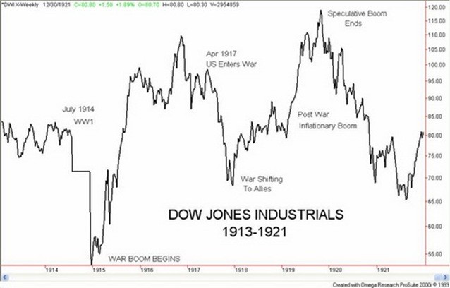 The stock market followed a classic pattern of fear and greed during WW1. Fear of war and fear of disruptions sparked sell-offs, while the realization that war was good for business and the war shifting in favour of the allies helped spark rallies.