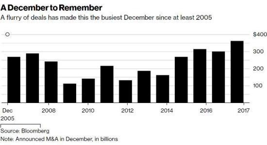 Companies have announced about $361 billion of mergers and acquisitions this month, making it the busiest December in at least 12 years, according to data compiled by Bloomberg. On Friday, the last work day before bankers and executives break for the holiday, GVC Holdings Plc of the U.K. agreed to buy bookmaker Ladbrokes Coral Group Plc for as much as 4 billion pounds ($5.4 billion), Deutsche Telekom AG said it will buy Liberty Global Plc’s Austrian unit and Roche Holding AG announced the $1.7 billion acquisition of U.S. biotech Ignyta Inc.