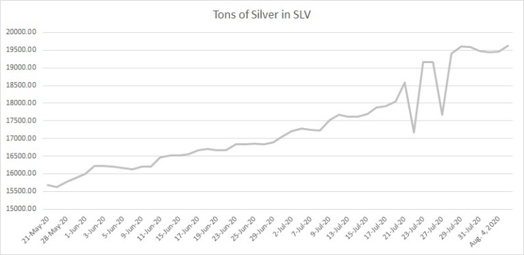 Since May 12, SLV goes up from 15.6K tons to 19.6K tons, a gain of 26%. Though of course, not all of them are Robinhood investors. A big price move will attract speculators ranging from rank amateurs to sophisticated professionals. For sure, some of this tonnage was added because of Robinhood investors, but we would not credit (blame) the added metal to any one class of speculators.