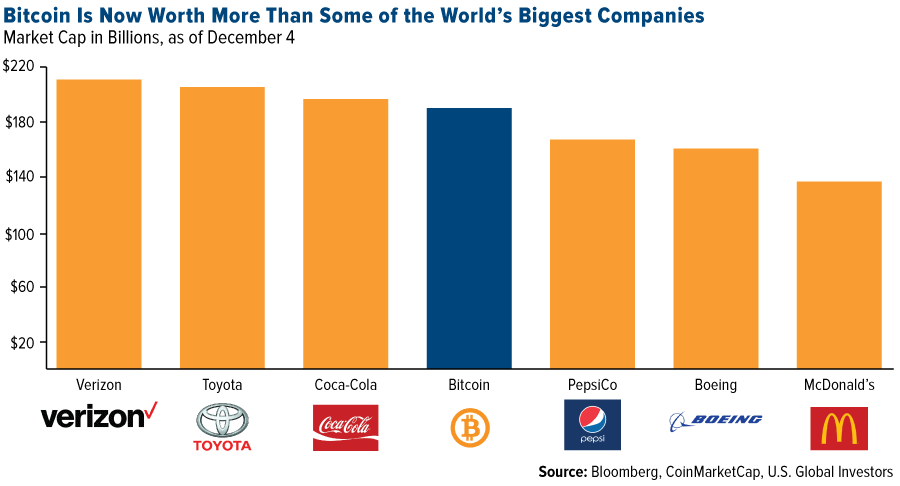 Case in point: When Bloomberg ran a particular story last Monday—“Bitcoin Is Now Bigger Than Buffett, Boeing and New Zealand”—bitcoin’s market cap hovered just above $185 billion, making it worth more than the likes of PepsiCo, Boeing and McDonald’s.