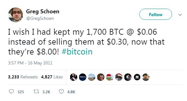 Or consider this: In May 2011, an early bitcoin investor named Greg Schoen tweeted his regret that he sold at $0.30, as the currency had then risen to $8.00 apiece.