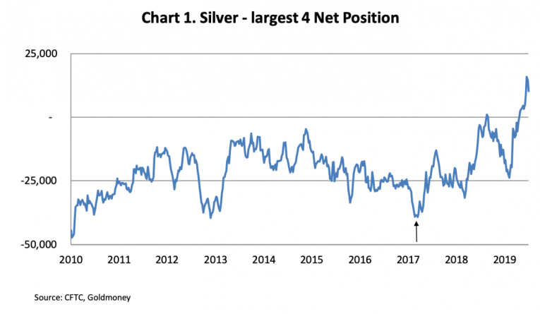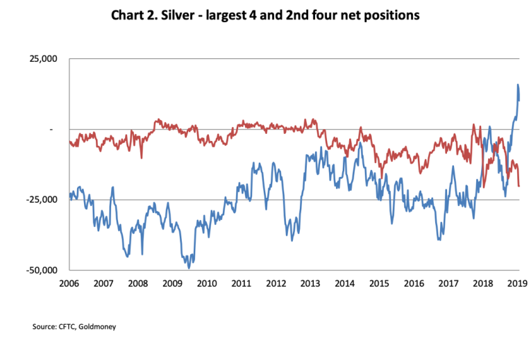 So, anyone can be a large reportable trader. Gross positions include straddles and swaps between different silver futures, and do not concern us. It is the net position ratios that are relevant. Chart 1 above is of the four largest traders net positions in the markets calculated on this basis.