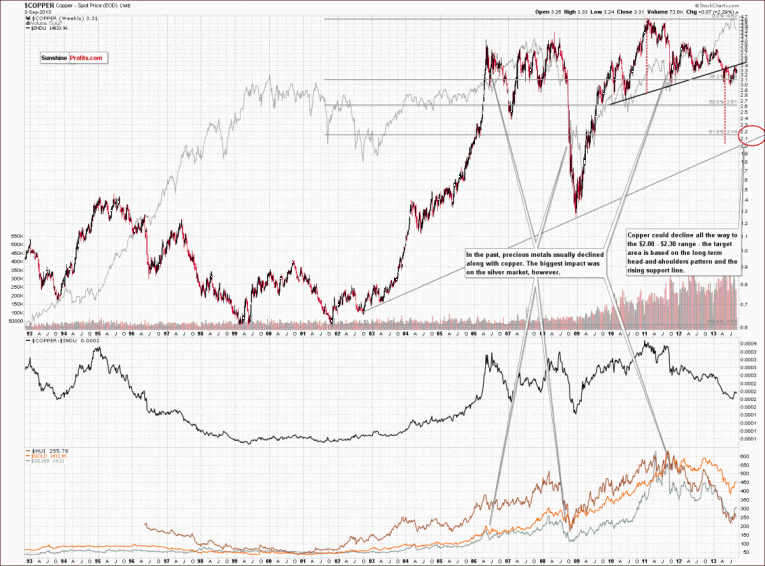 In our previous essays we took a closer look at the situation in gold from different perspectives. In our essay on gold and the dollar on September 3, 2013 (https://www.gold-eagle.com/article/recent-rally-gold-significant-improvement-or-just-bigger-pullback ) we wrote about the dollar‘s and the euro‘s implications for gold. At the end of August we also checked the stock market and the mining stocks for clues. In today’s essay we want to introduce you to the copper and palladium charts. Why have we decided to feature these charts? Because commodities usually move together on a short-term basis, even though they may evolve into different formations in the medium- and long term. Do they provide us with interesting clues as to the next possible moves in the entire sector? Let’s take a closer look at the charts below and find out. Let’s start with the copper chart (charts courtesy by http://stockcharts.com).