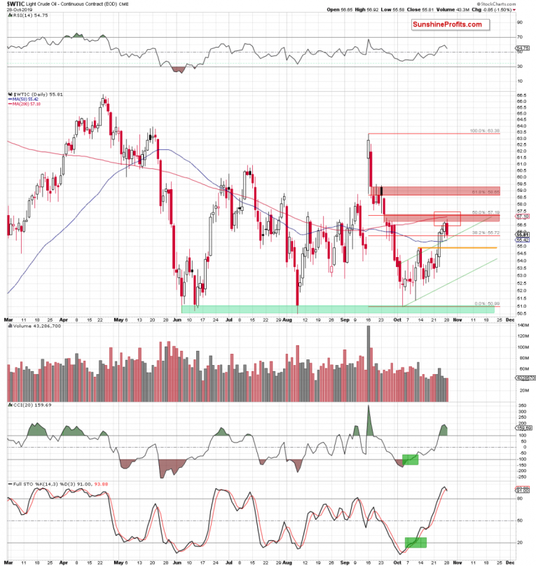 The daily chart shows that although crude oil-to-gold ratio opened yesterday’s session with a bullish gap, moving even higher after the markets’ open, the red gap created on September 24, 2019 stopped the bulls. It was the bears that took the reins in the following hours.