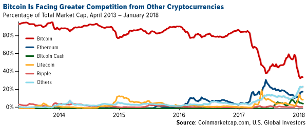 Competition among digital currencies is also heating up. Although bitcoin remains the top dog, it faces tough competition from the likes of Ethereum, Litecoin, Ripple and the other nearly-1,500 coins on the market today. It now accounts for about 40 percent of the entire market, down from almost 100 percent just a few years ago.