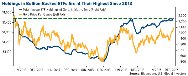 Coming back full circle to ETFs, Bloomberg reported last week that holdings in gold bullion-backed funds rose to their highest level since 2013 on a weaker U.S. dollar, rising geopolitical risk and growing expectations that inflation could finally heat up in 2018.