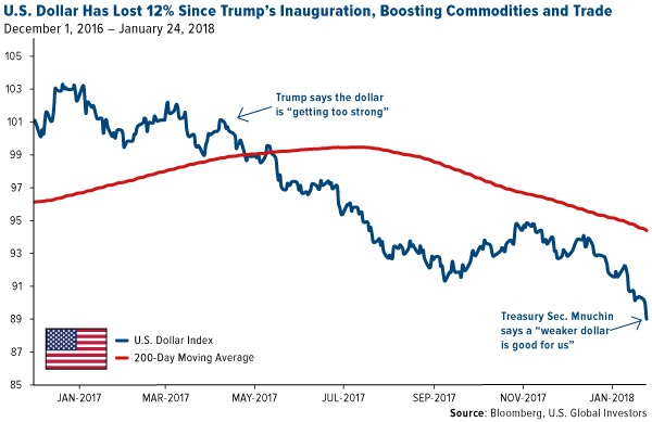 The U.S. dollar has plunged in value for the past several weeks, dipping more than 1 percent last Wednesday alone—the biggest one-day pullback in 10 months—following Treasury Secretary Steven Mnuchin’s comment at the World Economic Forum in Davos, Switzerland, that a weaker buck “is good for us as it’s related to trade and opportunities.” The greenback similarly tanked back in April 2017 when President Donald Trump said the dollar is “getting too strong.” Soon after, it fell below its 200-day moving average.