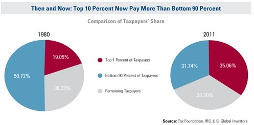 Take a look at how much this has changed over the past few decades. In 1980, the bottom 90 percent of taxpayers paid about half of the taxes. The top 1 percent contributed about 20 percent.
