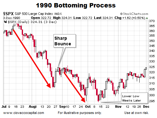 In 1990, MC Hammer was near the top of the charts. Stocks were on the lower end of the charts, peaking in July and then making a series of lower lows before finding a bottom.