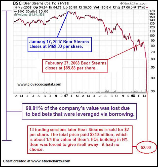 Well, by March 14th, 2008 liquidity and financial conditions deteriorated rapidly at Bear Stearns. We also must remember, that Lehman Brothers, an investment bank that had started right after the Civil War, also collapsed and went bankrupt in a very short period of time: