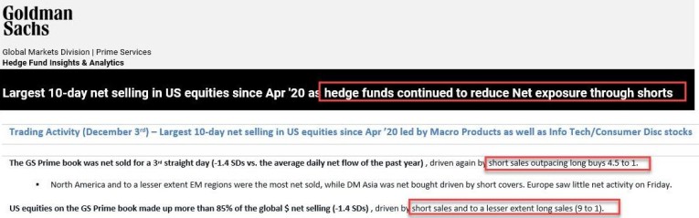To explain, with hedge funds increasing their short bets a little too late, Goldman Sachs Prime Brokerage reported that last week, “US equities on the GS Prime book made up more than 85% of the global $ net selling (-1.4 SDs), driven by short sales and to a lesser extent long sales (9 to 1).”
