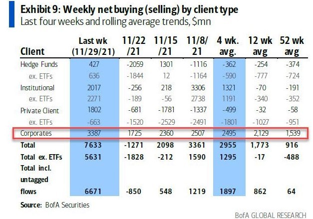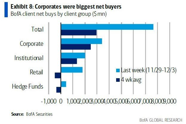 What’s more, while Bank of America said that hedge funds and retail investors somewhat bought the dip last week (though, they’re still net-sellers over the last four weeks), corporations did much of the heavy lifting.