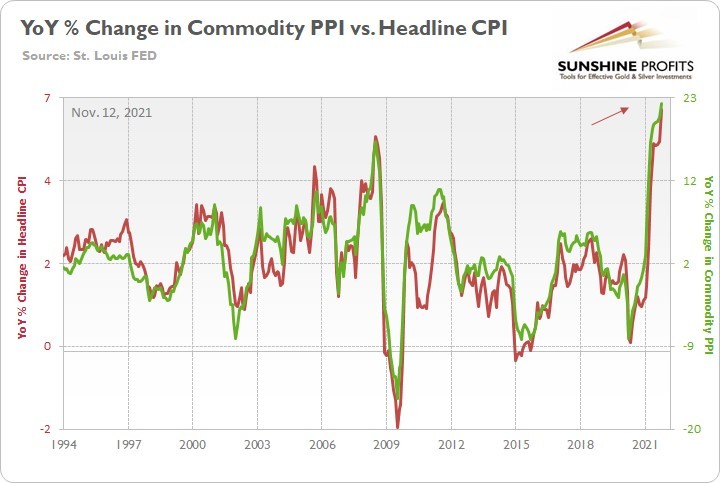 I’ve highlighted on several occasions how the Commodity Producer Price Index (PPI) often leads the following month’s headline CPI. And after the former increased by 2% month-over-month (MoM) on Nov. 9 – which is a material MoM increase – and by 22.2% YoY (a new 2021 high), it implies a headline CPI print of roughly 5.75% to 6.25% when the data is released on Dec. 10.