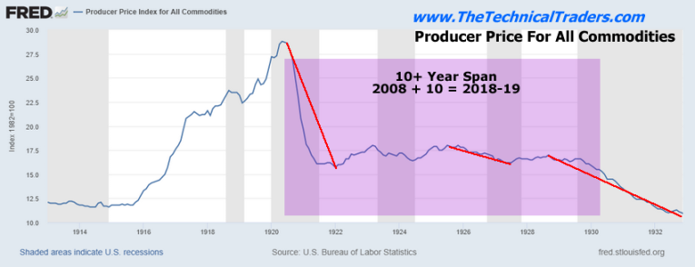 You may remember this chart from the earlier sections of this multi-part article. It highlights what happened leading up to the 1929 stock market crash and how early warning signs of manufacturing and agriculture weakness continued to plague the markets while speculation in housing and the stock market pushed certain asset values much higher near the end of the “Roaring 20s”.