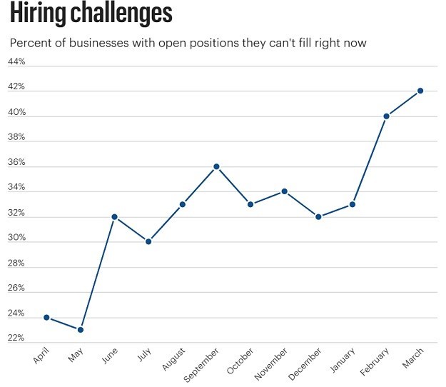 According to a March survey by the National Federation for Independent Business, 42% of business owners reported job openings they couldn’t fill — a record high, and 20 percentage points higher than the 48-year historical average of 22%.