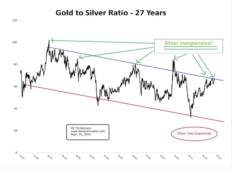 GOLD TO SILVER RATIO: The ratio is currently about 66 – near the high end of the slowly declining range for the past 27 years. See the graph and note that a high ratio indicates silver is too inexpensive in relation to gold. All of the ratio peaks (February 1991, March 1995, March – May 2003, October 2008, and July 2013) occurred at significant silver lows.