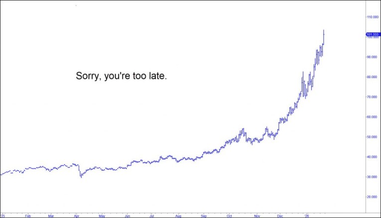 Silver’s current rise has been orderly, more or less, but with a pitch so steep that it caught many players with their pants down.  No reason to feel sorry for them, since they are ethically and morally on a level with child molesters, broad-tossers and cannibals.  But the radical shift in precious-metal prices relative to all other classes of investable assets raises a question that should concern us all.  For it is not happening in a vacuum, and we can only guess at what it will mean years down the road. Will silver resume a monetary role? Is Trump licking his chops over the prospect of borrowing against all of the gold supposedly stored in Ft. Knox?  Is gold predicting a crisis that would leave the global money system in wreckage? We’ll have our answer eventually, but it could already be very late in the game for those seeking the bomb-proof safe haven that gold has always offered.