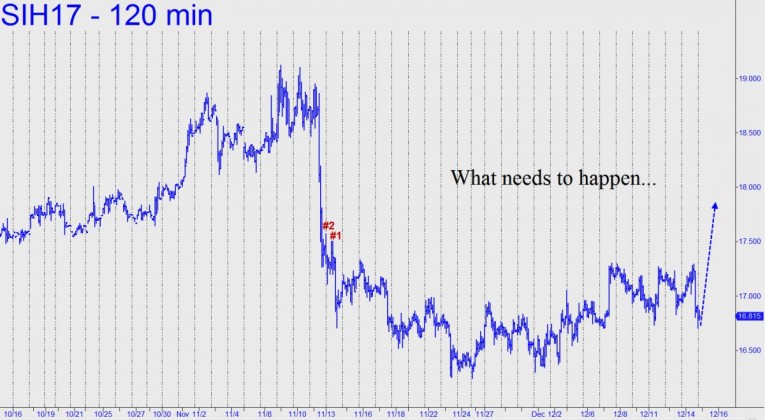 Were that to occur, we could expect March Silver to fall to at least 15.995 before finding traction for a reversal attempt. On the 120-minute chart, the coordinates for that target, a midpoint Hidden Pivot support, are as follows: A=18.860 (11/11); B=16.245 (11/24); and C=17.300.