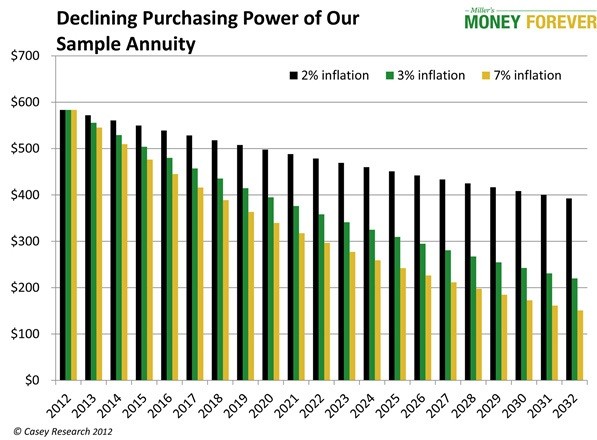 And under the 7% scenario, you’ll only be able to pay for the electricity bill with less than $50 in purchasing power left over. That’s hardly the lifetime income most annuity buyers had in mind.