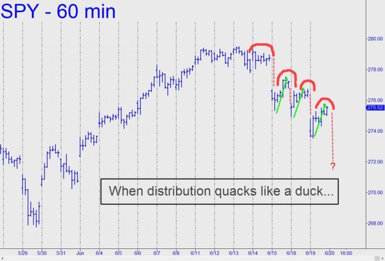 I mention all of this so that Rick’s Picks readers don’t get sucked into what feels like flagrant and pernicious distribution lately by the smart money. For all of us, of course, it is ultimately about making money no matter what the market does, and we should expect to do so regardless of which way stocks are headed. Today, for instance, a SPY chart posted in the chat room by “Nervis Novice” prompted some Hidden Pivot analysis that caught the exact-to-the-penny 273.53 low of a plunge that saw the Dow down more than 400 points at low ebb. A timely interpretation of Nervis’ chart allowed subscribers to buy expiring June 275 calls at or near their low of the day, 0.42, for a quick and easy doubler. (The options nearly tripled, actually, trading as high as 1.16 before the session ended.)