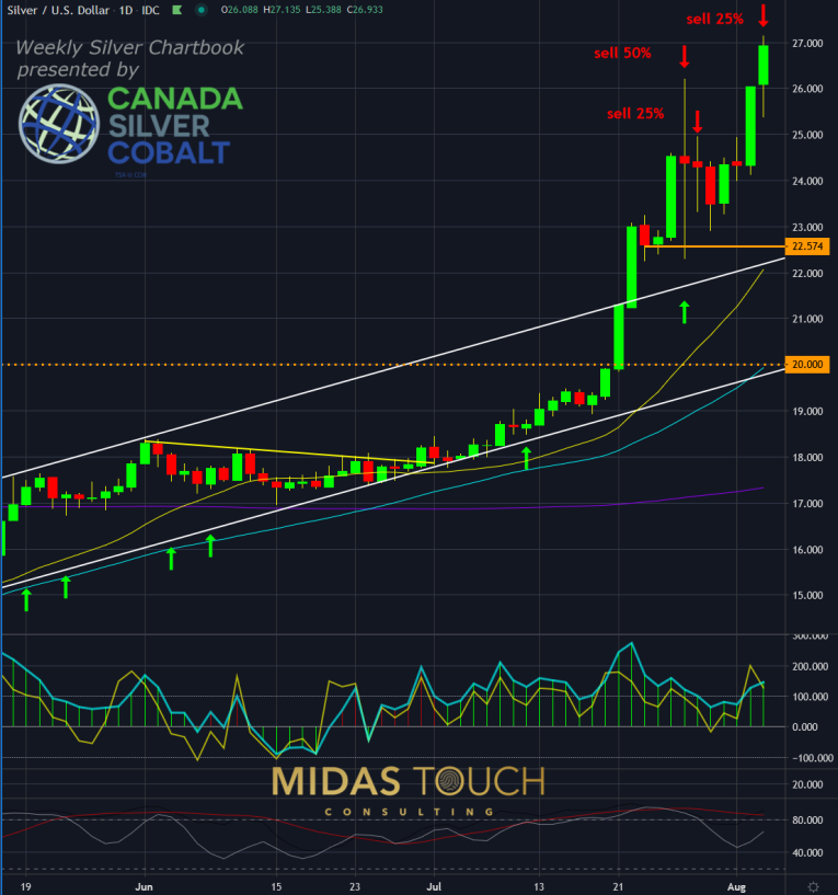 We are still holding runners from entry levels of US$11.97 (3/18/20), US$12.52 (3/23/20), US$14.01 (3/31/20), US$13.95 (4/1/20) and US$19.33 (7/17/20). Without this additional exposure, we would have not exited this specific position. Due to the fact of silver being in an extended up move at these levels which increases total position exposure risk versus runner reward, it was sensible to lighten the load. This frees capital for reentries at lower price levels.