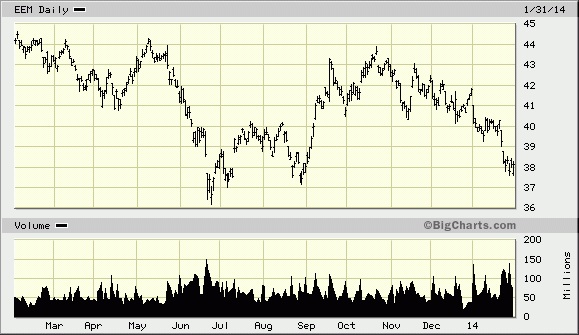 In view of the two important long-term cycles bottoming this year, perhaps it’s no coincidence that we’re witnessing a revival of emerging market troubles. Argentina is faced with the specter of default while Brazil’s currency is under pressure. A potential debt crisis brewing in China has the potential to roil global markets on a scale not seen since 2008. The Emerging Markets ETF (EEM) chart shown below throws into relief the extent to which these countries are being roiled by the final “hard down” phase of the 40-year cycle.