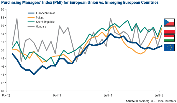 As you can see, the European Union (EU) as a whole has recently improved, but emerging countries such as the Czech Republic, Poland and Hungary are posting very solid numbers in the mid-50s range. Much of this is due to low fuel costs and weaker currencies, which make exports more attractive.