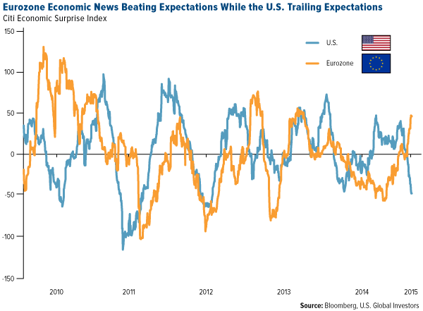 You can see above where the eurozone has surprised consensus. For most of 2014, the region was in a declining trend, whereas the U.S. was headed higher. More recently, though, we’ve seen a huge advancement in Europe, despite negative news coming out of areas such as Greece—which last week managed to strike a deal with its euro-partners to extend the Mediterranean country’s bailout program by four months.