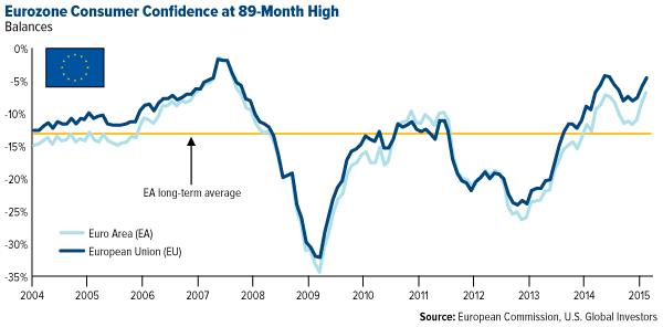 Another sign that the European recovery is underway is the recent uptick in spending habits. Not only does the consumer confidence index (CCI) for the eurozone far exceed its long-term average, but it’s also at its highest reading since soon before the financial crisis.