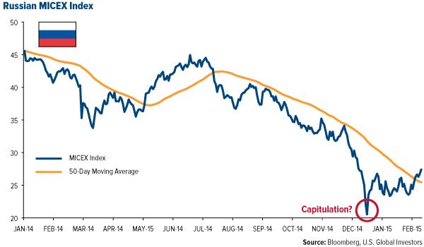 Nearly every day we’re reminded of Russia’s political and financial troubles, but the worst is likely behind us. It appears as if Russia’s market and currency, the ruble, bottomed in mid-December. This is also the first time since the summer that the MICEX Index crossed above its 50-day moving average, breaking through resistance.