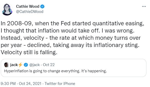 The tweet made the argument that inflation didn’t take hold after 2008-09 because the velocity of money fell instead, and since it is still falling that inflation is not a current issue either. However, Cathie Wood’s assertion inflation cannot happen because the velocity of money is falling has no basis in reality.