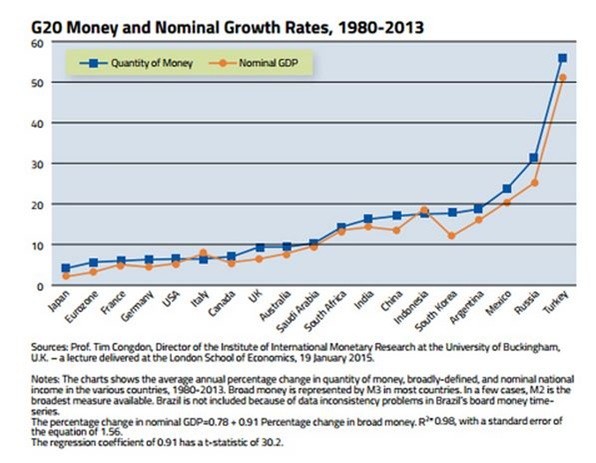 The course of an economy is determined by the course of that economy's money supply (broadly determined). The relationship between money growth and nominal GDP growth is presented in the accompanying chart. It is persuasive. Indeed, money, not fiscal policy, dominates.