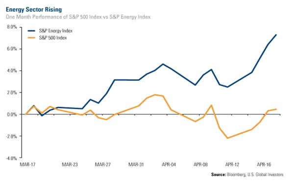 Over the last month the energy sector has outperformed the market, and as you can see in the chart below, has done so by 6.5 percent. Year-to-date the sector is beating the S&P500 Index by over 3 percent.