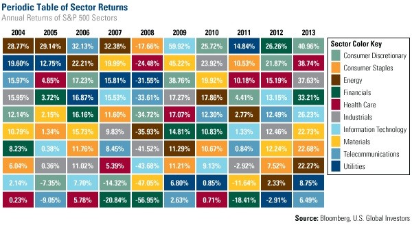 As our Director of Research John Derrick describes in our recent video on the Periodic Table of Sector Returns, it is not unusual to see sectors move from top to bottom from one year to the next. For example, energy ranked as one of the top-performing sectors from 2004 through 2007, but quickly lost momentum in 2008 when it was hit the hardest after the financial crisis. In 2012 and 2013 energy turned in some solid numbers, but lagged in comparison to the other sectors.