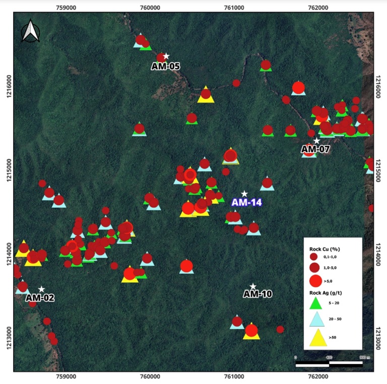 Figure 1: 15-km corridor of high-grade copper-silver mineralization at AM