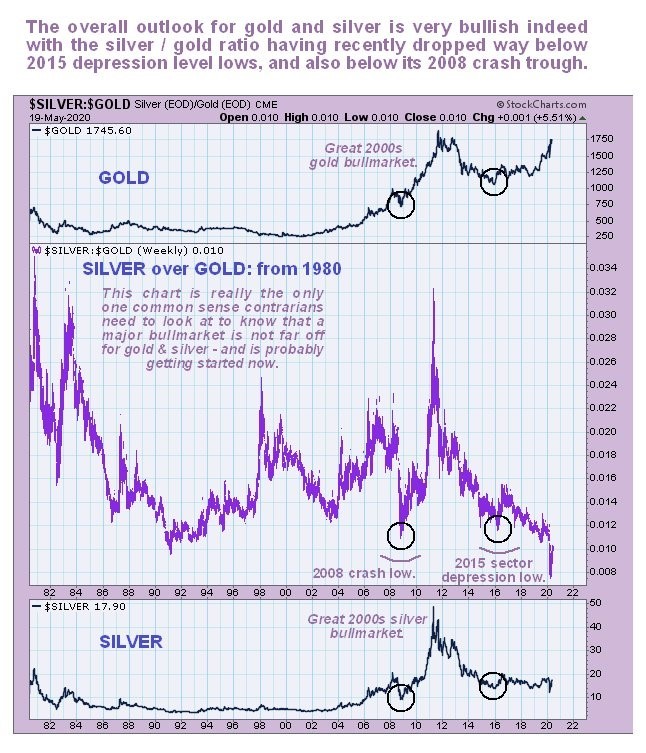 Another factor that we have for a long time now taken as a strong indication of an incubating bull market is the silver-gold ratio which recently reached an incredible low extreme as we can see on its long-term chart going back to 1980 below. Most low extremes on this indicator have coincided with sector bottoms, the most notable examples being at the 2008 crash low and 2015–2016 sector depression low, which were followed by major sector uptrends. Recently this ratio fell to a freak low which was a sure sign that the sector had hit bottom. Now it is recovering as silver at last starts to join the party. Gold has been rising for some time and is now starting to challenge its dollar highs and it has opened up a huge divergence with silver that will be resolved by a roaring bull market in silver.