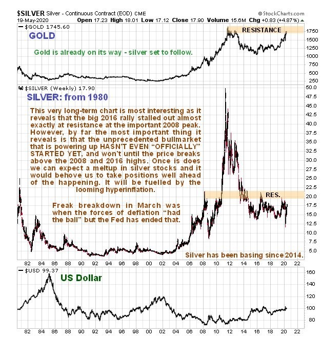Now we will turn to the most interesting very long-term chart for silver, which also goes back to 1980 to allow direct comparison with the silver to gold ratio chart above. The first point to note is that the big rally during the 1st half of 2016 stalled out almost exactly at the resistance at the 2008 highs. But by far the most important point to observe is that the unprecedented massive bull market that is now incubating HAS NOT EVEN OFFICIALLY STARTED YET, AND WON'T UNTIL SILVER BREAKS ABOVE THE KEY RESISTANCE SHOWN ON THE CHART APPROACHING $21. Until that happens reactions are possible, but once this breakout occurs the entire sector is likely to go ballistic.