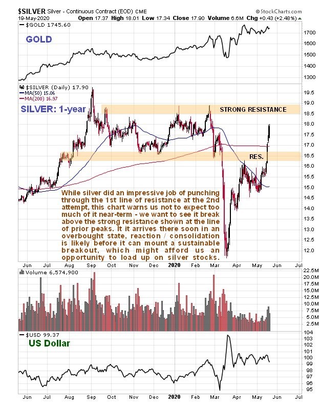 Now we will turn to the 1-year chart for silver to get a feel for what is going on right now. Whilst annotating this chart, I realized that we probably don't need to panic about getting the silver stocks on board, because the really big action in most of them won't start until the silver price breaks above the resistance approaching $21 that we looked at on the long-term chart, and on this chart we can see that it first has to contend with a quite strong zone of resistance approaching a line of peaks near to $19. While the current sharp advance looks like it will soon bring it to this resistance, it will arrive there in a very overbought state, which makes it quite likely that it will pause to react/consolidate, and any minor weakness at that juncture would provide us with an opportunity to load up the silver stocks on our list at somewhat better prices.