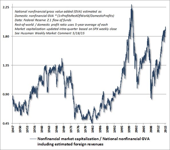 Indeed, across a wide range of measures including price/trailing earnings, price/forward operating earnings, the Fed Model, price/book value, price/dividend, Shiller P/E, Tobin’s Q, market capitalization to GDP, and even S&P 500 price/revenue, the ratio-based valuation measure most tightly correlated with actual subsequent S&P 500 nominal total returns over the following decade is the ratio of nonfinancial market capitalization to national nonfinancial gross value added (which I introduced in order to account for the estimated impact of foreign revenues). We’ll simply call this measure “market cap/GVA.” Call it the “Hussman Ratio” if you want it to be completely dismissed by investors here, and to suddenly become a revered valuation metric after all the horses have left the stable. Champ to chump, chump to champ. Bubble-era soundtrack of value investors everywhere.