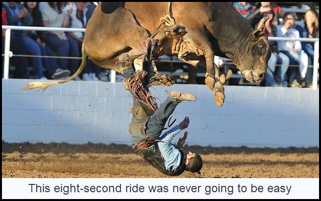 No one said it would be easy to get short at the top. This bull market is proving especially challenging to fade because the herd knows how grotesquely overvalued stocks are. With so many traders eager to bet the 'don't' line, the broad averages have started to behave like El Diablo (see photo above). The Dow has staged three 600-point-plus rallies-to-nowhere since peaking two weeks ago, but none lasted for more than a day. Although bull riders must hang on for eight seconds to claim a prize, traders could conceivably have to endure weeks or even months of loco price action to hit it big. Many will get busted up badly trying.