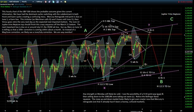 Things look to get wild as we likely rally to slight new highs by June 3 near 2134/35 SPX! This means that after an initial top to bottom drop of about 30 points on Monday, we should see a 50 point rise in less than 2 trading days! Then to make things crazier, we should fall all the way to the 2074/75 area by June 12, interrupted with a huge rally June 8 to June 10. This is the way things have been going with this schizoid market: “I have no place to put my money; stocks are too expensive; buy-sell-buy-sell-buy-sell ad nauseam.”