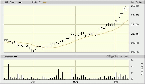 In the meantime, foreign investors are moving to the dollar as the U.S. has emerged as the world’s premier safe-haven economy. Below is a chart of the PowerShares U.S. Dollar Bullish Fund (UUP), a proxy for the dollar index. UUP has had an explosive last two weeks and stands at a new new 52-week high – the first one in a long while.