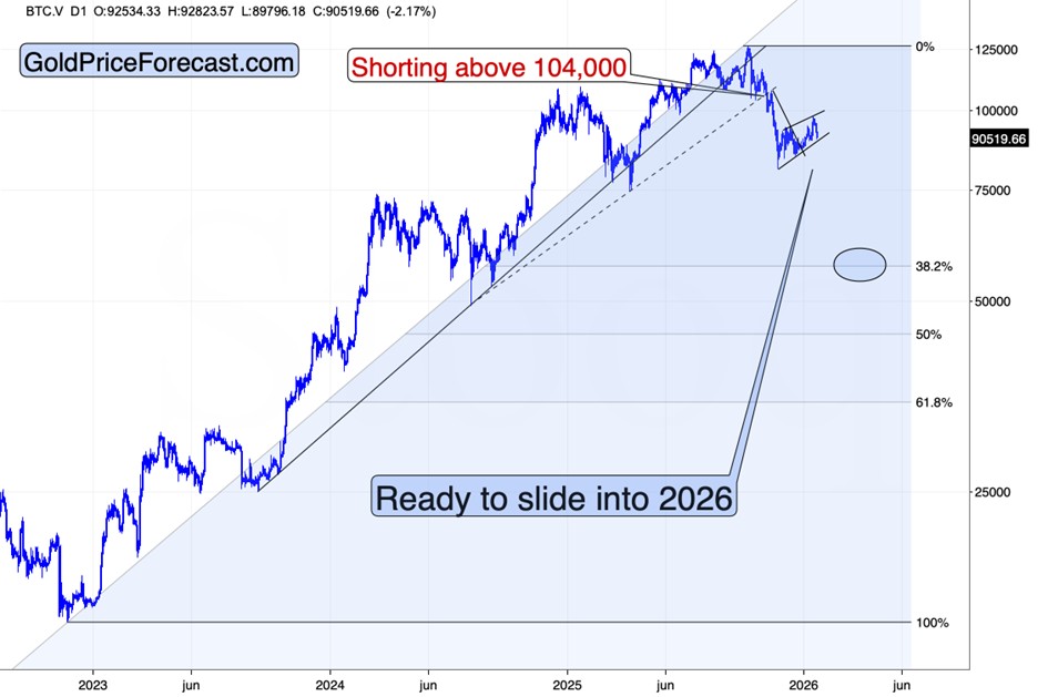 We’ve been shorting it since the $104k level (actually shorting above it), and it looks like the flag pattern is about to be complete with the downside target well below bitcoin’s 2025 lows.