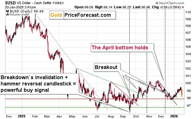 Regarding time frames – given the current momentum, we could see silver at $120 as early as in February or March. However, it’ a big maybe – if the USD Index rallies and gold declines as the above-discussed risk premium diminishes, silver could decline as well. However, silver has its own unique situation – the physical tightness could attract buyers that will once again push it higher. That’s why I’m not exiting the long positions in silver right now.