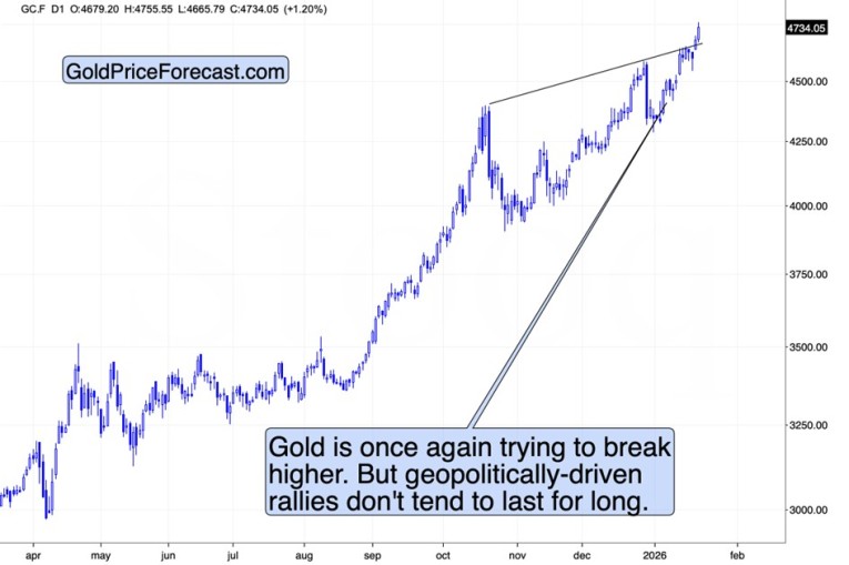 Gold soared once again, but – as I wrote yesterday – once we get a sudden resolution regarding Greenland – likely based on some other accommodation that Trump can frame as his victory – it’s likely to decline just as fast as the risk premium declines.