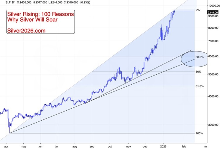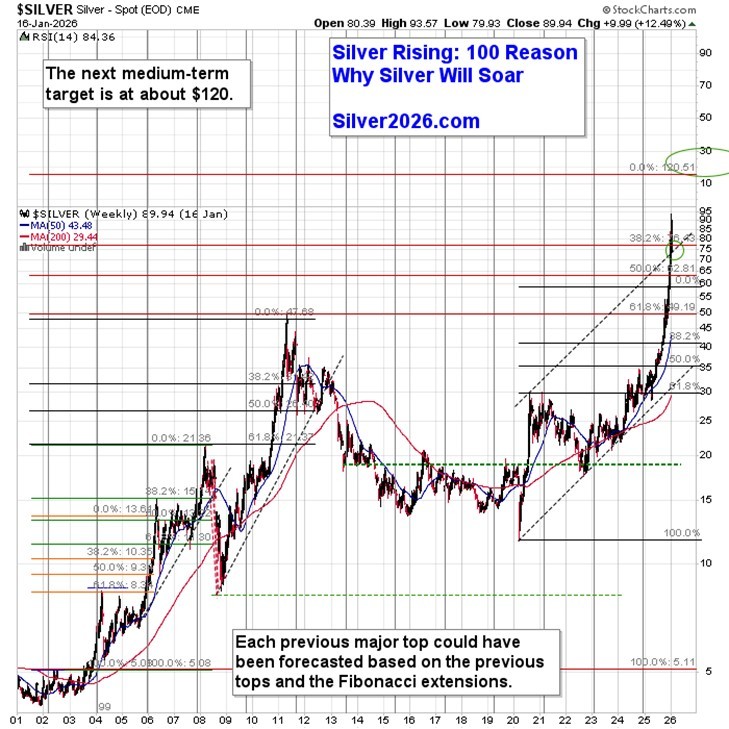 However, as you know, based on the Silver Rising (Silver2026.com) book, there are 100 catalysts driving silver higher. It will not be the price itself that likely stops silver from rallying further, but rather most of the catalysts playing out or being cancelled in one way or another. By being aware of them, we’re able to monitor the market and know more or less when the market is close to forming its major top. I think we’re 1-4 years from that final top.