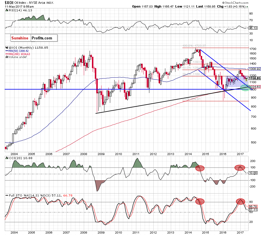 Looking at the long-term chart, we see that the overall situation hasn’t changed much as oil stocks are still trading slightly below the previously-broken upper border of the blue consolidation. Additionally, the sell signals generated by the CCI and the Stochastic Oscillator remain in place, suggesting another attempt to move lower.