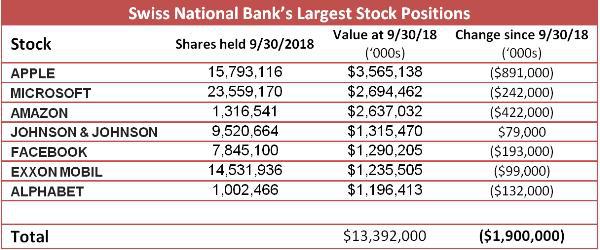 A few years ago the Swiss National Bank (SNB) – which traditionally held “monetary assets” like government bonds, cash and gold to back up the Swiss franc — decided to branch out into common stocks.