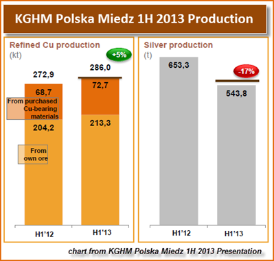 According to KGHM Polska Meidz’s 1H 2013 presentation, the decline in silver production was due to lower silver content in processed concentrate, lack of delivery of purchased concentrate with higher silver content and to a change in the schedule for the maintenance shutdown of the Precious Metal Plant.