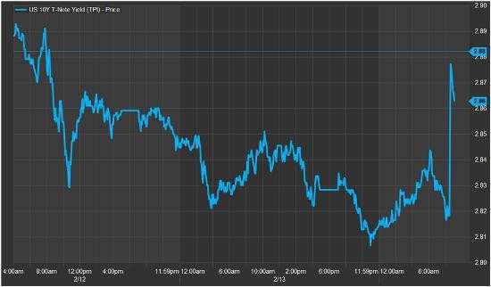 The yield on the benchmark 10-year Treasury note jumped to 2.882 percent as of 10:03 a.m. ET. It hit a four-year high of 2.902 percent on Monday. The yield on the 30-year bond was last seen higher at 3.146 percent. Bond yields move inversely to their prices.